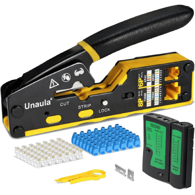 Ideal for Ethernet and Data Cable connectors. Pass-Thru connectors allow for flush-cut cables. Includes cable tester.